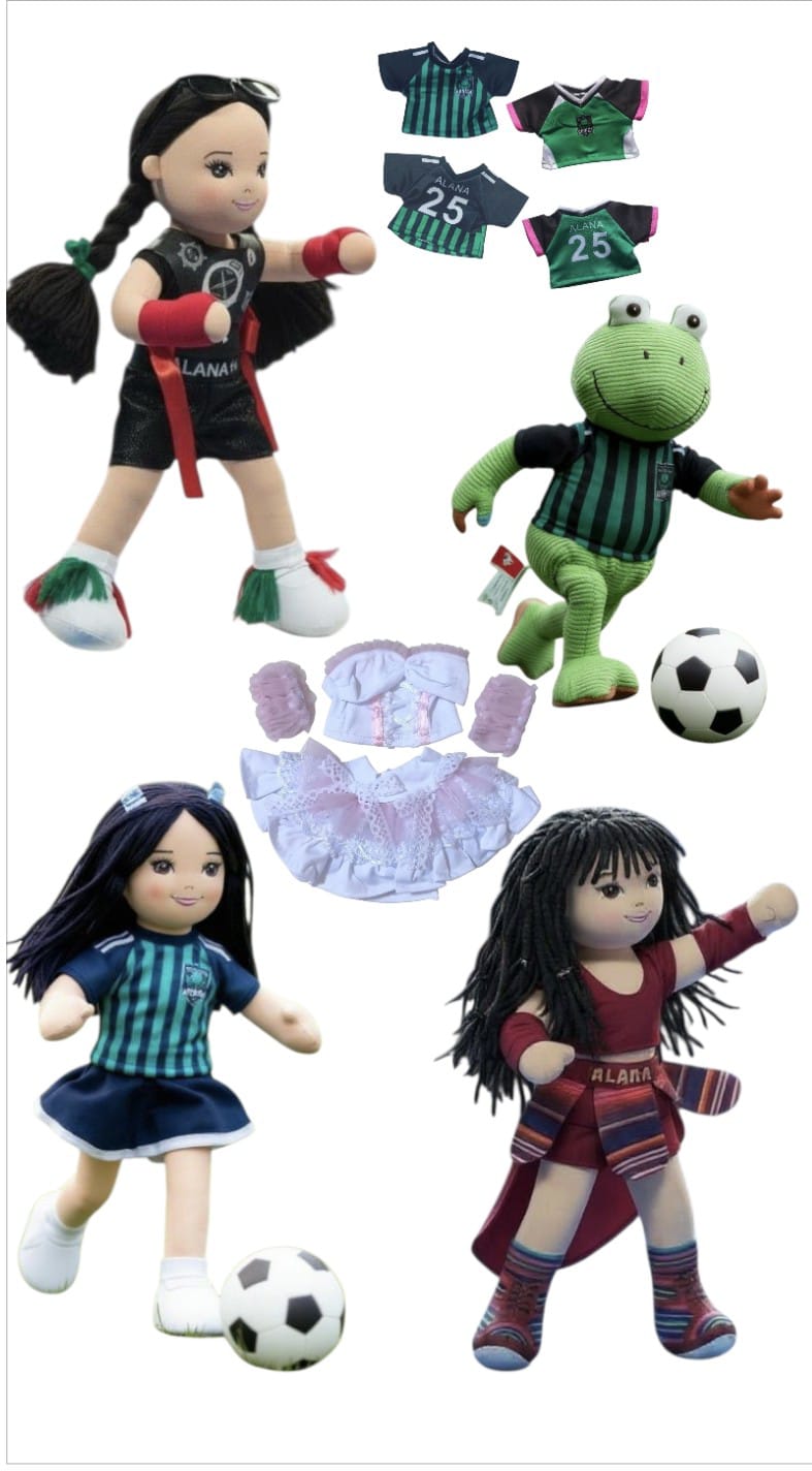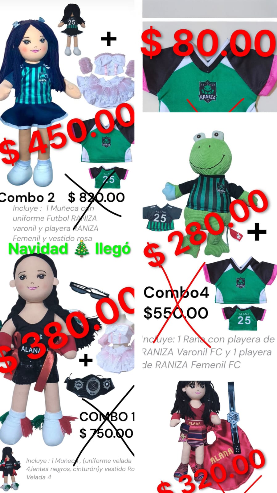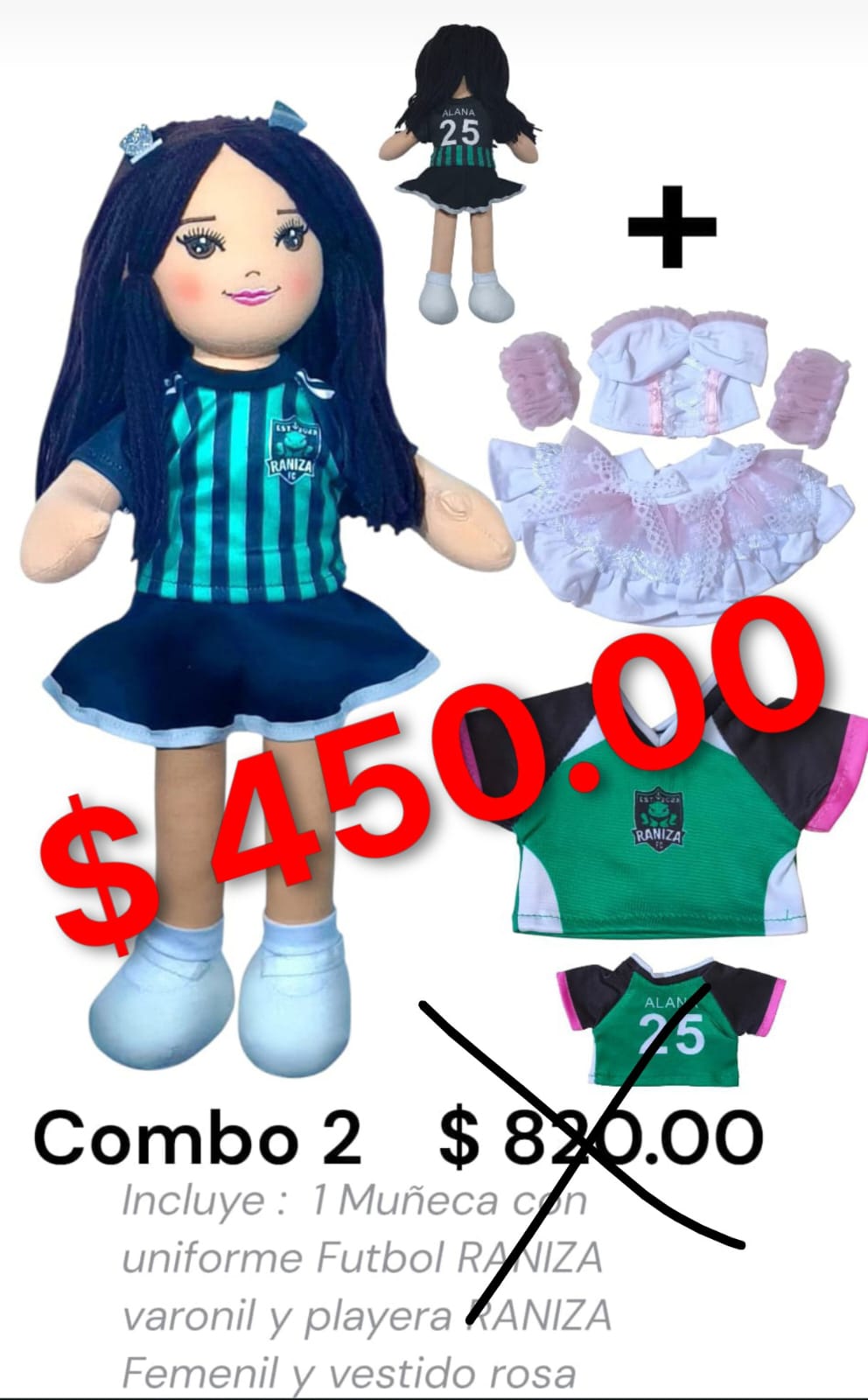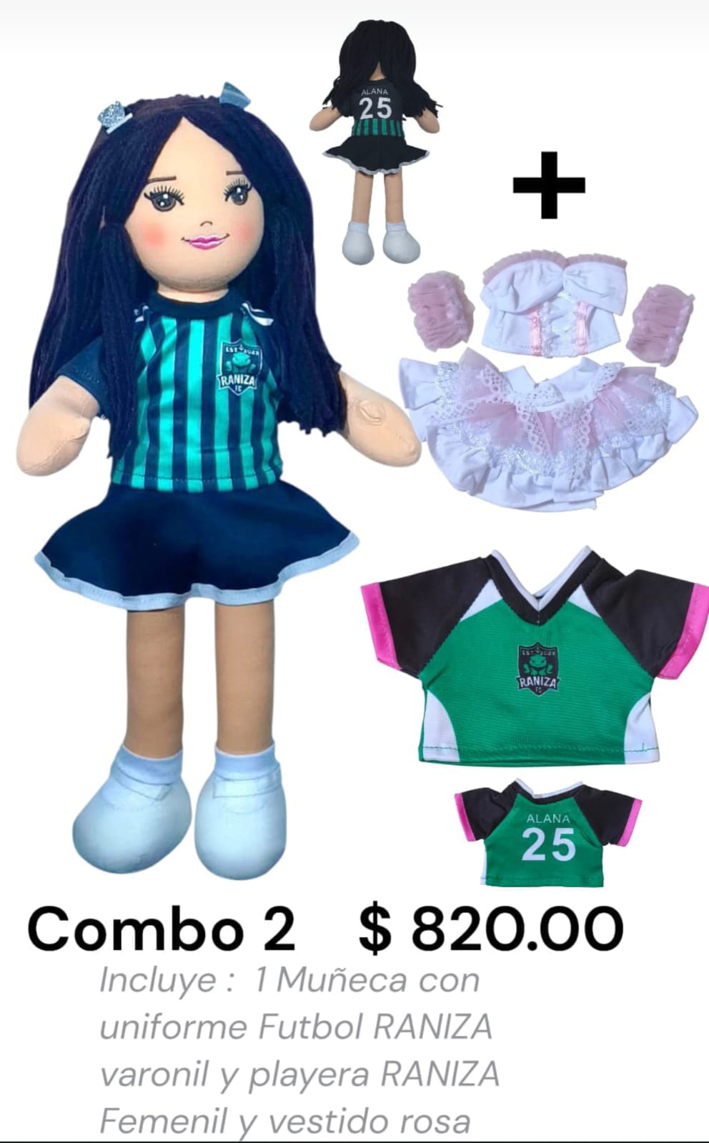 • 1 muñeca con uniforme de Futbol RANIZA FC varonil, con número y nombre en la parte trasera.