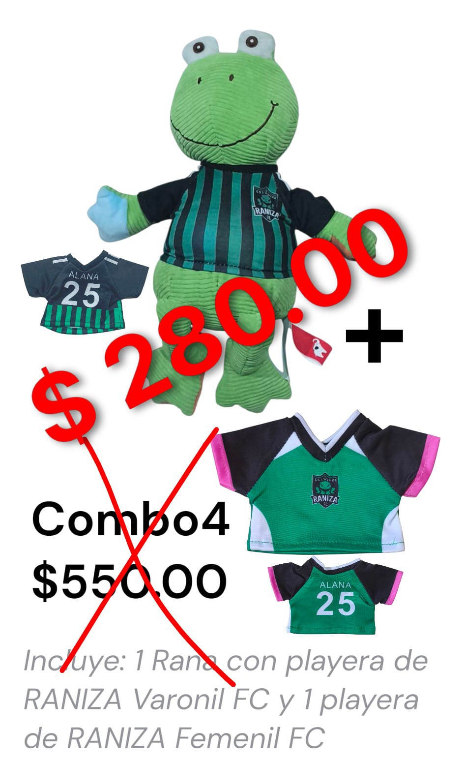 • 1 rana de peluche vestida con la playera oficial del RANIZA FC varonil, con número y nombre.